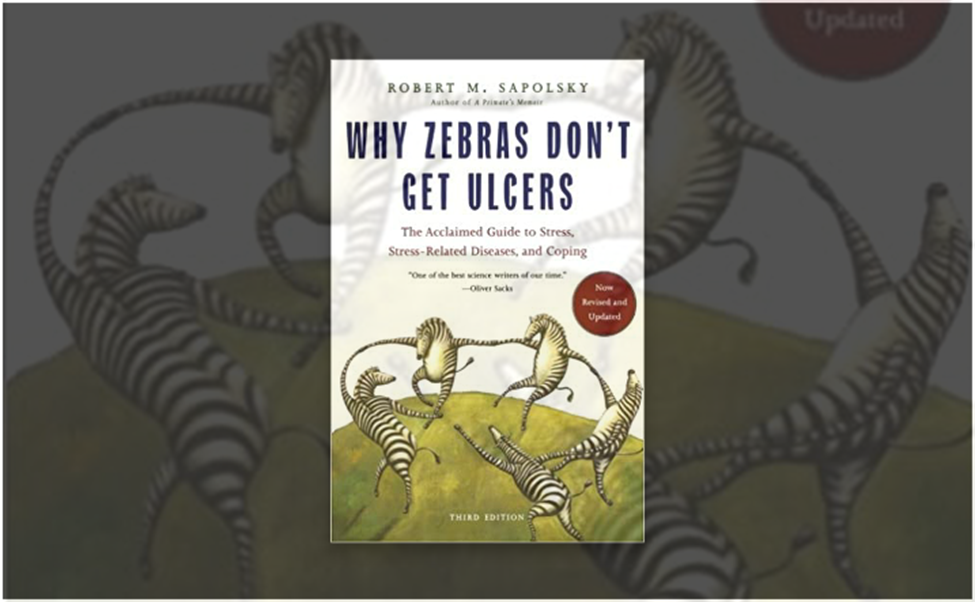 Die onderwerp van die boek is om die wasigheid rondom stres as konsep te verduidelik deur ?n vergelyking te tref tussen die mens en die zebra. Hoe verskeie hormone en dele van die brein mobiliseer in reaksie op stres. Die fokus is op die effek van stres op bloedvloei, die immunsisteem, stoor van energie, groei, reproduksie ens. Ook word die verband tussen stres en siekte toestande soos major depressie, slaap en verslawing bespreek. ?n Maklike leesboek wat goeie insig bied oor die siel/liggaam verbintenis.